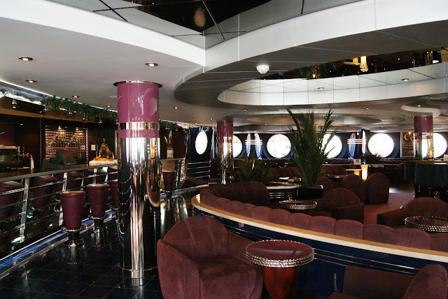 El barco nos ofrece diez bares y salones diferentes, cada uno de ellos único, y la mayoría ubicados en las cubiertas cinco, seis y siete. Hay un pequeño atrio de solo tres pisos de altura con el mostrador de recepción, excursiones en tierra y otros servicios para pasajeros en la planta baja. El prólogo de la cubierta cinco presenta el hermoso Strand Theatre, uno de los teatros más perfectos que he visto en el mar. Está perfectamente diseñado sin una sola columna que pueda bloquear la visión y está inclinado sobre dos cubiertas para que ésta sea perfecta.